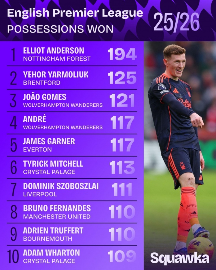 1月27日讯 Squawka统计了本赛季球员在英超夺得球权的次数,并列出榜单,埃利奥特·安德森194次断层居首。