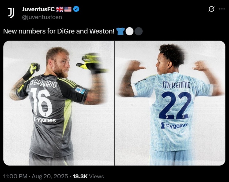 尤文官宣,迪格雷戈里奥以及麦肯尼更换号码。